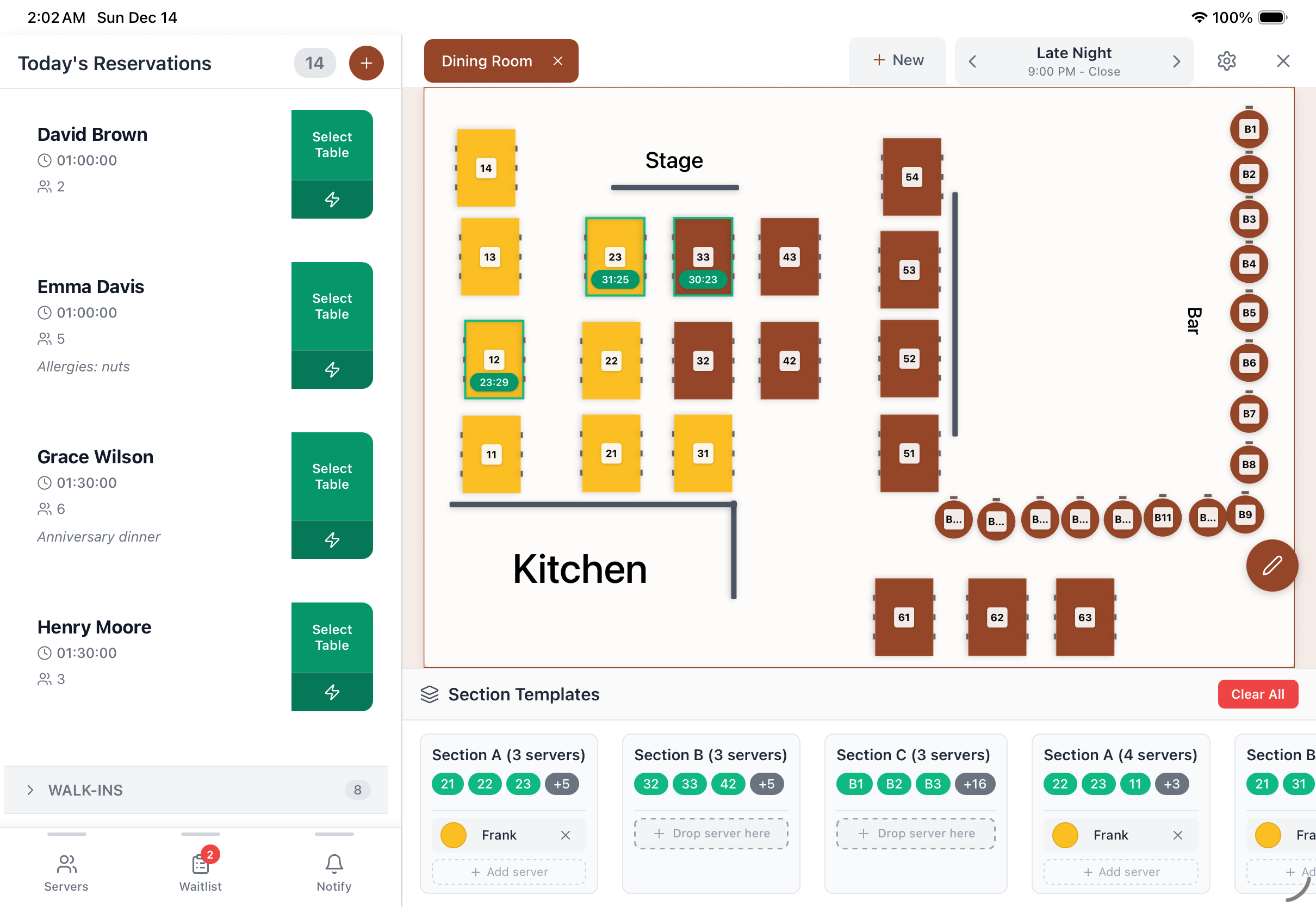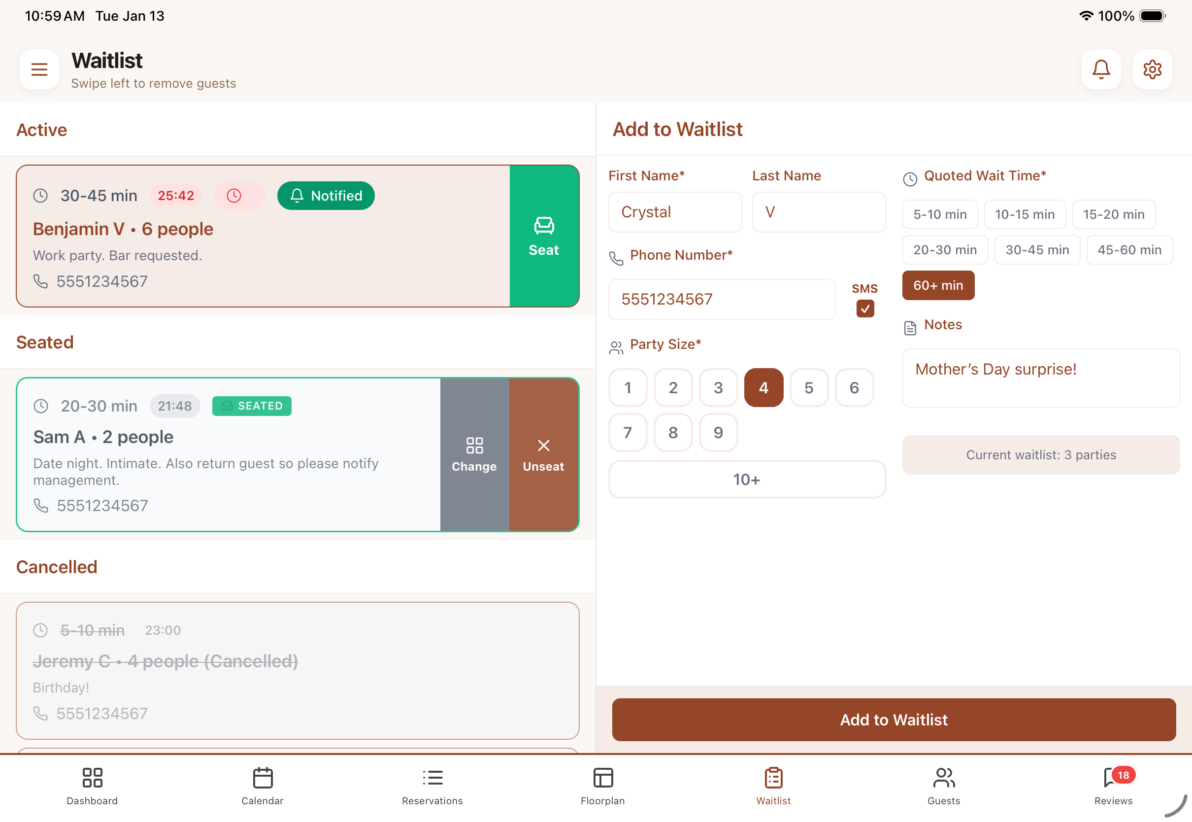 Add walk-ins to a waitlist and notify them when their table is available via text, keeping your restaurant full and guests happy!
