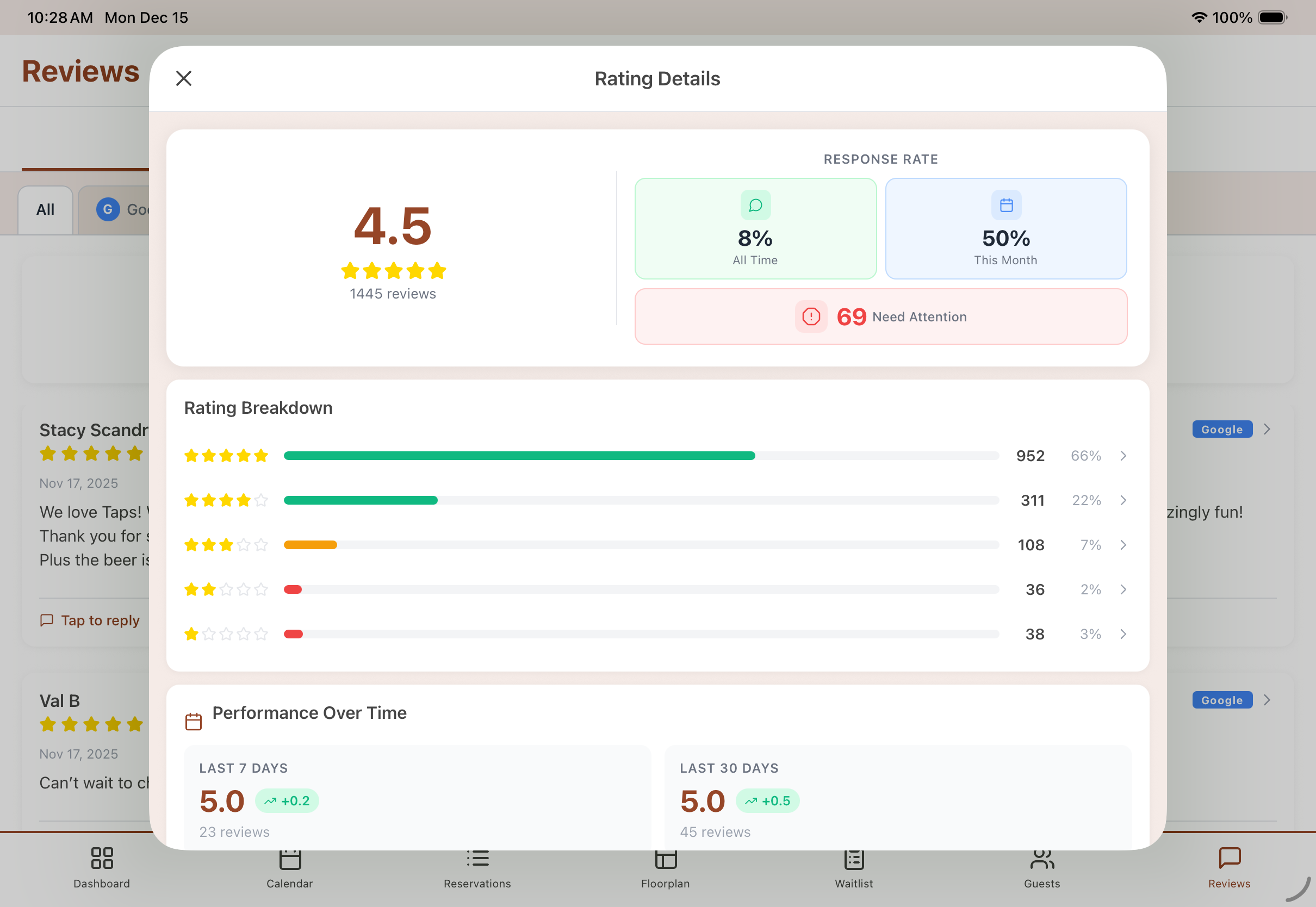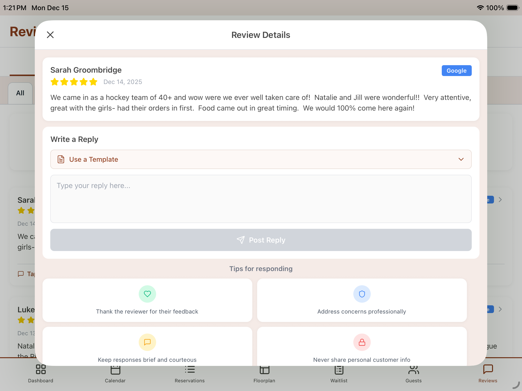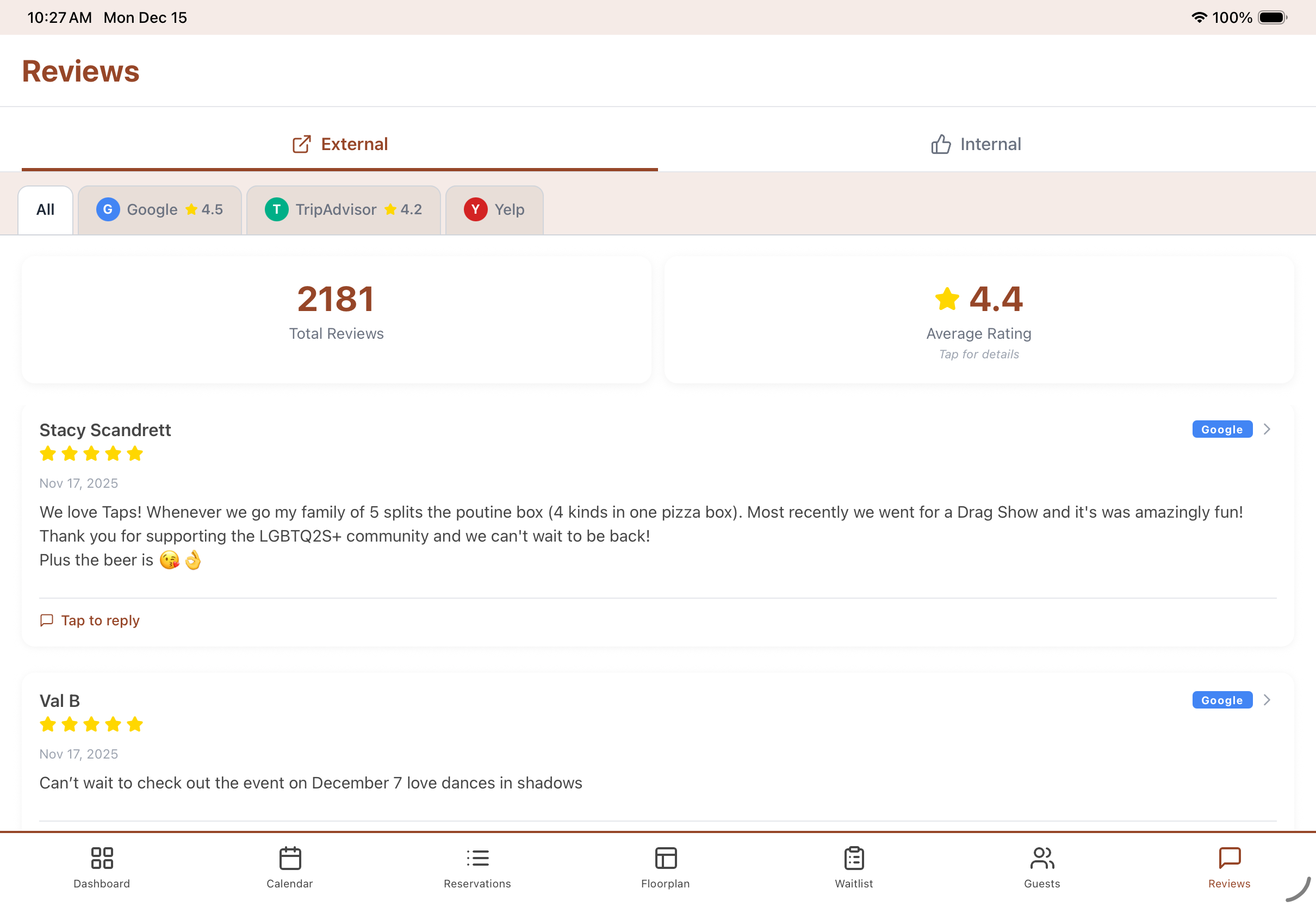 Stay on top of your restaurant's reputation! View all your customer reviews in one place, respond directly to feedback, and track review analytics to understand what your guests love most.